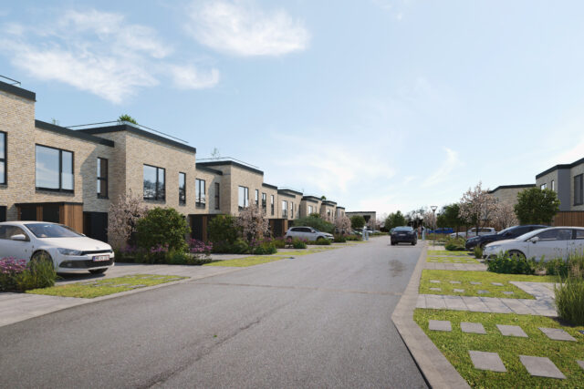 Naturen er trukket med helt hen til vejkanten ved hver enkelt Town House, så du både får en varieret beplantning i alle skel og græsgrønne ankomstområder langs de rolige veje.
